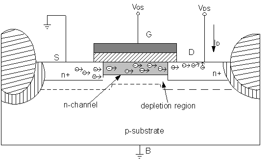 Further increases in the gate voltage result in additional electrons in the thin inversion layer directly under the oxide. These are drawn from the heavily doped n+ source region. Hence, a continue n-type channel is formed between the source and drain region.