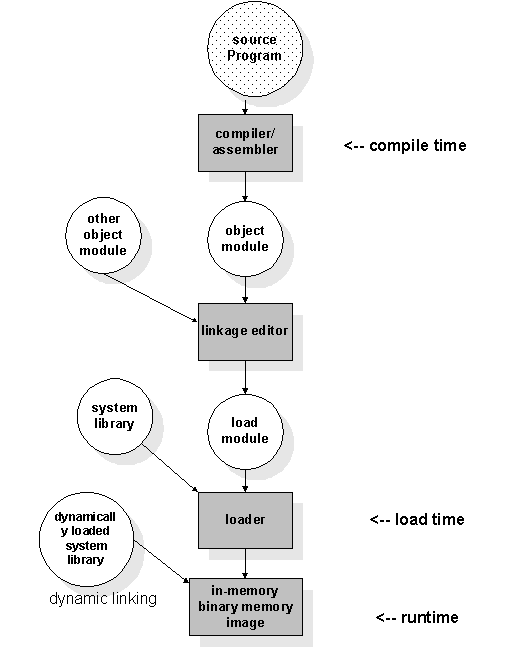 From Figure 7, we can tell for a typical application program to execute on hardware platform will go through three main steps: compile time, load time and runtime. Compile time is the compiler/assembler working time, as mentioned before. To obtain better memory-space utilization, modern operating system use dynamic loading which means main program is loaded into memory and executed, when a routine needs to call another routine, the calling routine first checks to see if the callee routine has been loaded, if not, the loader is called to load desired routine into memory and then control is passed to newly loaded routine. [3]