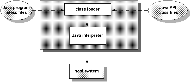 The JVM consists of a class loader and a Java interpreter that executes the architecture-neutral bytecodes. The class loader loads .class files from both the Java program and the Java API for execution by the Java interpreter. The Java interpreter may be a software interpreter that interprets the bytecodes one at a time, or it may be a just-in-time (JIT) compiler that turns the architecture-neutral bytecodes into native machine language for the host computer. In other instances, the interpreter may be implemented in a hardware chip that executes Java bytecodes natively.
